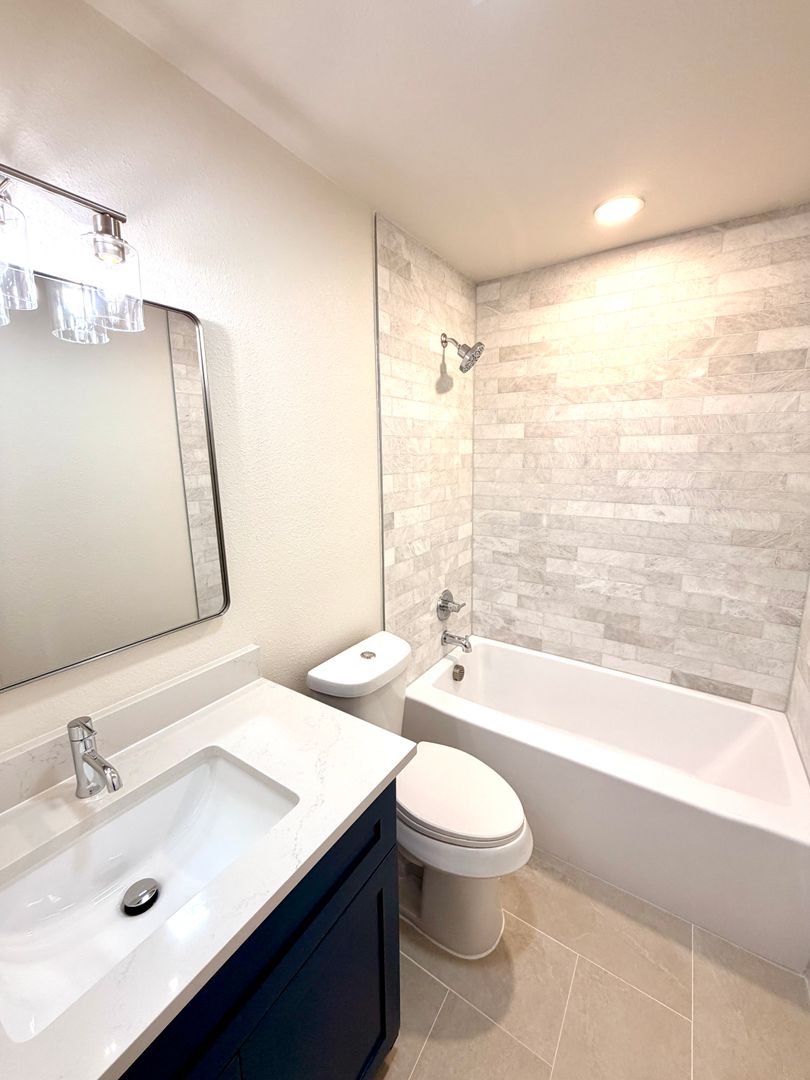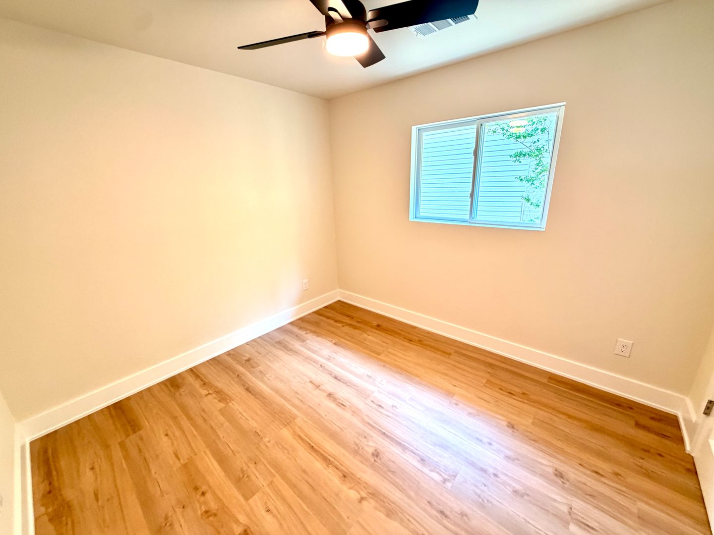 This fully renovated home offers high-end finishes rarely found at this price point. The open-concept layout features brand-new LVP flooring throughout, a spacious living area with arched windows, modern black ceiling fans, and a sleek fireplace. The kitchen is a standout with floor-to-ceiling navy shaker cabinetry, quartz countertops, stainless steel appliances, large-format tile flooring, and direct access to the backyard. Both bathrooms have been completely updated. The primary suite includes a frameless walk-in shower with marble-look tile, dual quartz vanity, and upgraded lighting. The secondary bath features a soaking tub with a full tile surround. The primary bedroom also includes a custom built-in wall unit with integrated desk, ideal for a home office or remote work setup. Exterior features include a bold navy and white color scheme, arched windows, and mature trees that provide strong curb appeal. Located just blocks from greenbelt trails, parks, tennis courts, and volleyball. Convenient access to PGBT, I-35, and the Dallas North Tollway. Zoned to Thompson Elementary.