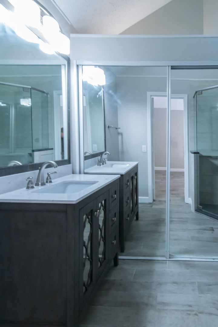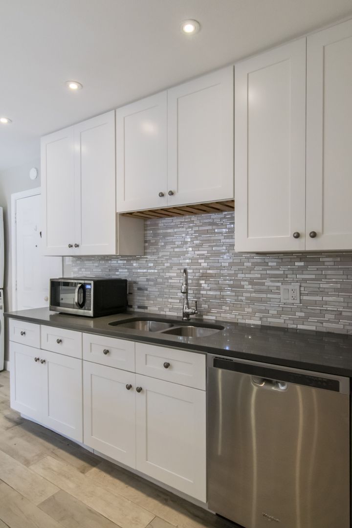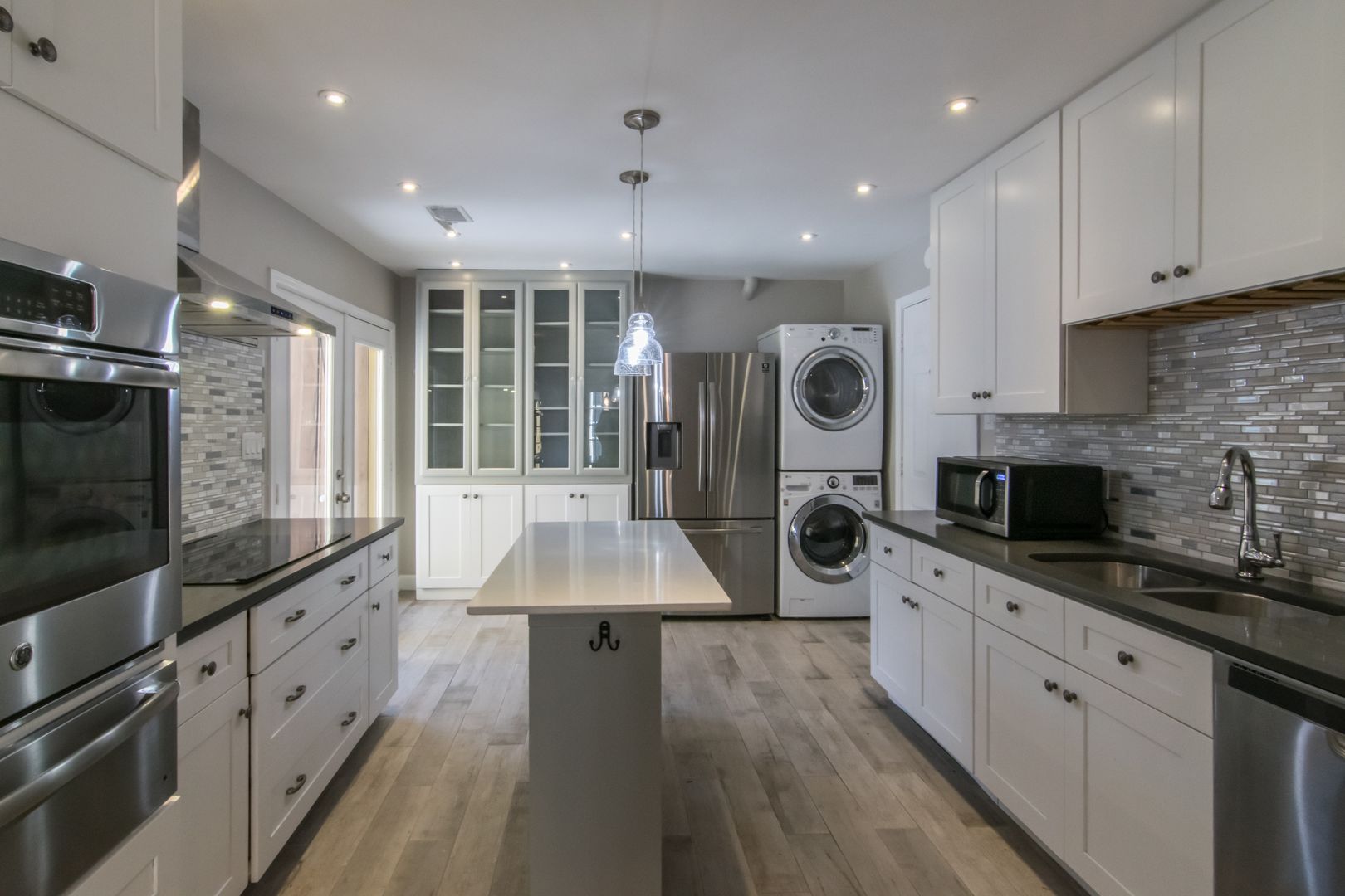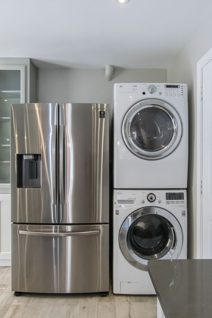 Stunning home with all the updates. Grey ceramic plank tile floors. Bathrooms have quartz counters & custom showers. Open kitchen has high end appliances, glass front wood white shaker cabinets and grey quartz countertops. The focal fireplace has a floor to ceiling black quartz stone façade. Other updates include full size stacked washer & dryer, LED lights & fixtures, Nest thermostat. 2 private patios.