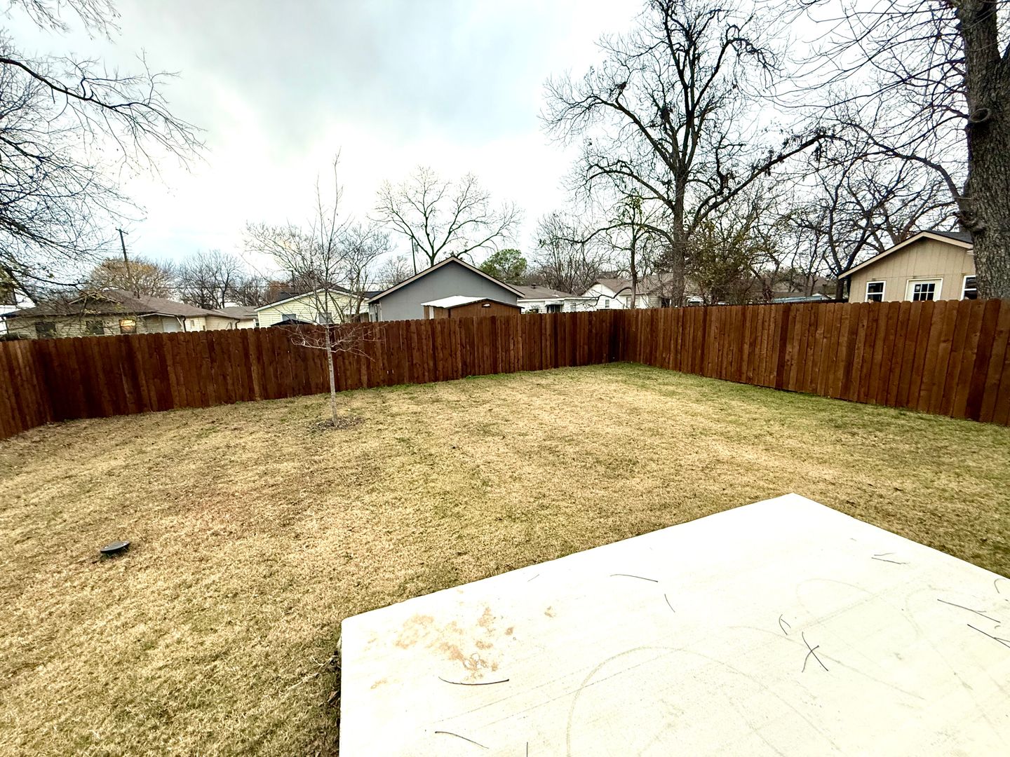 The backyard is fully fenced with a cedar fence and an iron gate, providing privacy and security. Enjoy the outdoors on the concrete patio, surrounded by freshly laid sod. Located near Hwy 75, shopping, and dining, this rental offers a convenient lifestyle with everything you need just a short distance away.