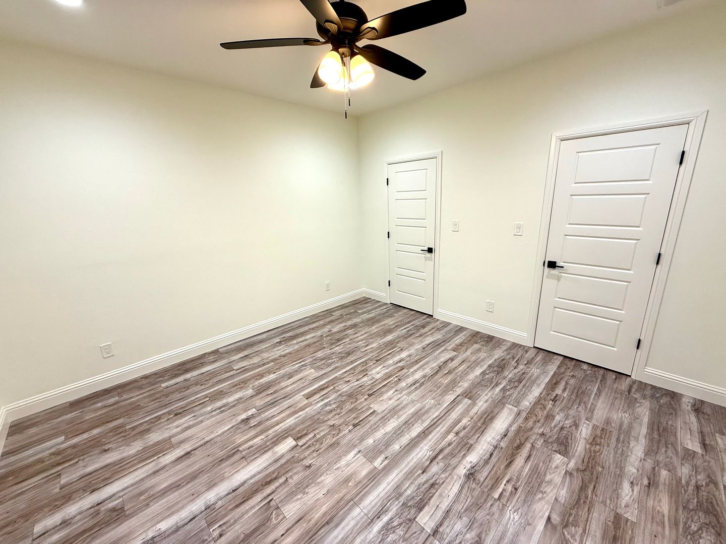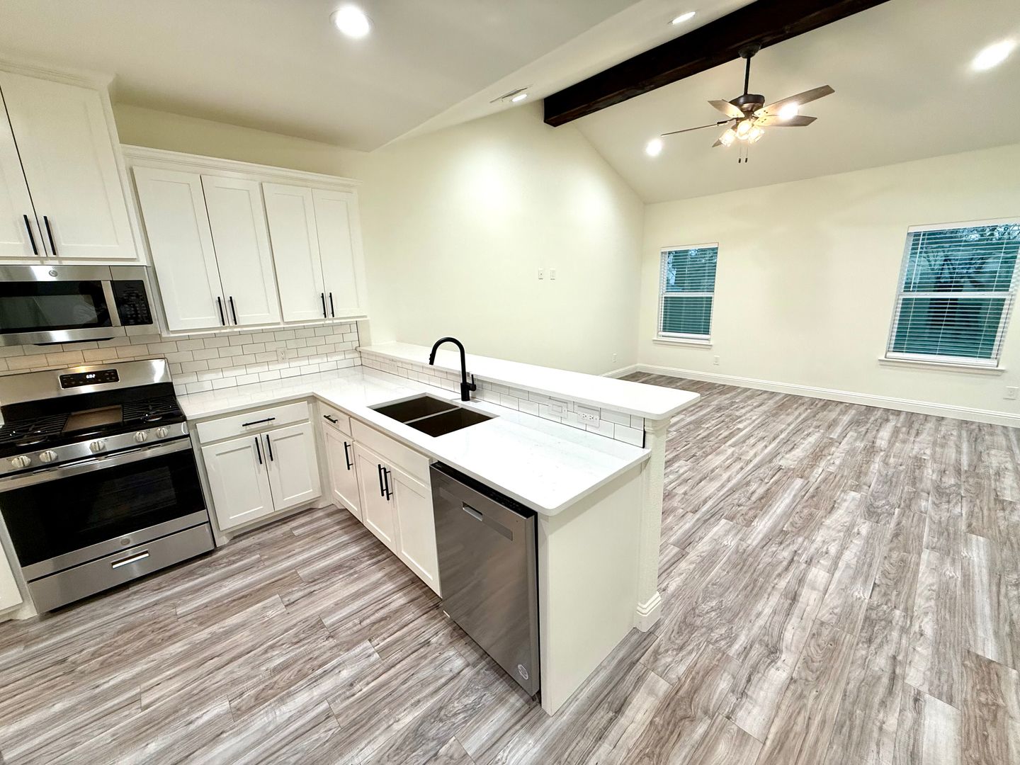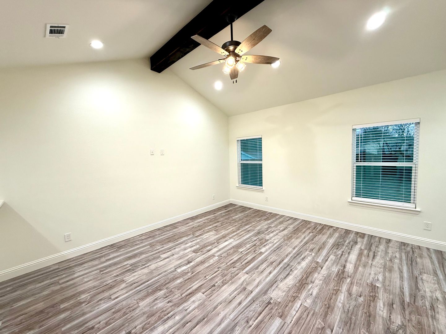 The spacious, open-concept floor plan is designed for easy living, with a vaulted ceiling featuring a striking wooden beam. The living, dining, and kitchen areas are finished with low-maintenance laminate flooring, giving the home a warm, contemporary feel. Additional highlights include 2-inch wood blinds throughout, ceiling fans in all bedrooms, a separate laundry room with wood cabinets for extra storage, and termite protection for peace of mind.