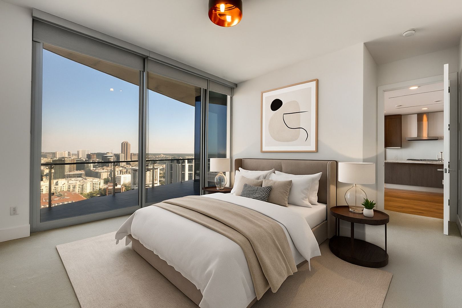 Luxury 26th-floor condo in the Bleu Ciel buildinb. 2 bedrooms, 2.5 baths, 1,527 sq ft, private 2-car garage, cover flows to the balcony with an outdoor fireplace. Gourmet kitchen, top-tier finishes, and premier amenities in Dallas’s Harwood District.